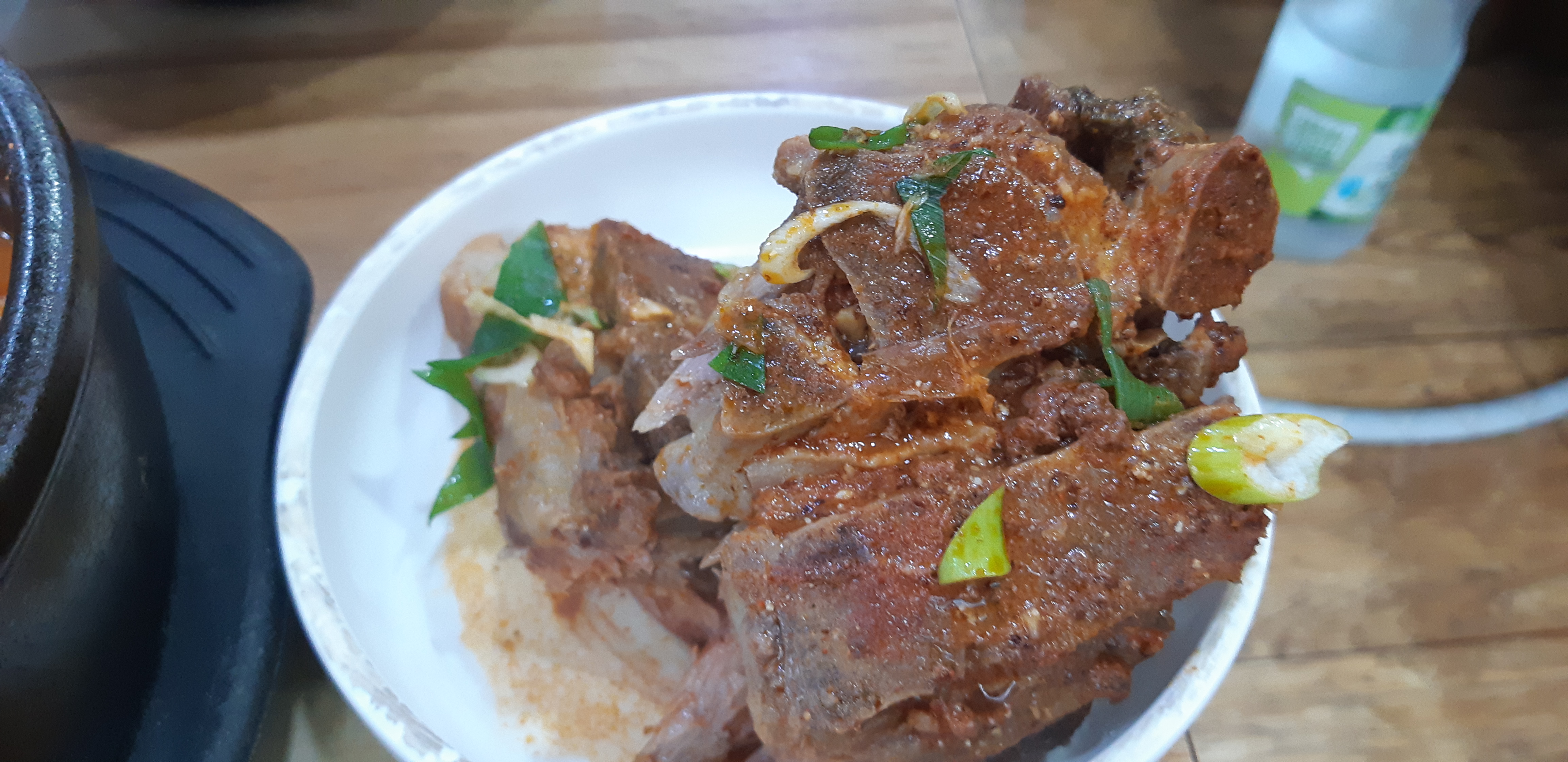 고기는 뼈해장국 1인용 뚝배기 기준으로 세덩이 정도 들어있다.
